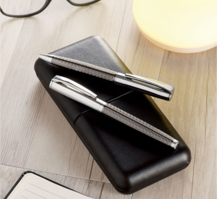 Περιστροφικό στυλό με ανασυρόμενο μηχανισμό, διακεκριμένο δίχρωμο σχέδιο σε λευκό με κομψές ροζ χρυσές πινελιές.
