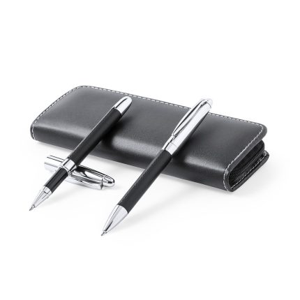 Ξεχωριστό σετ στυλό και roller στυλό, σχεδιασμένα και τα δύο με κομψά μαύρα σώματα αλουμινίου και ροζ χρυσά διακοσμητικά στοιχεία.