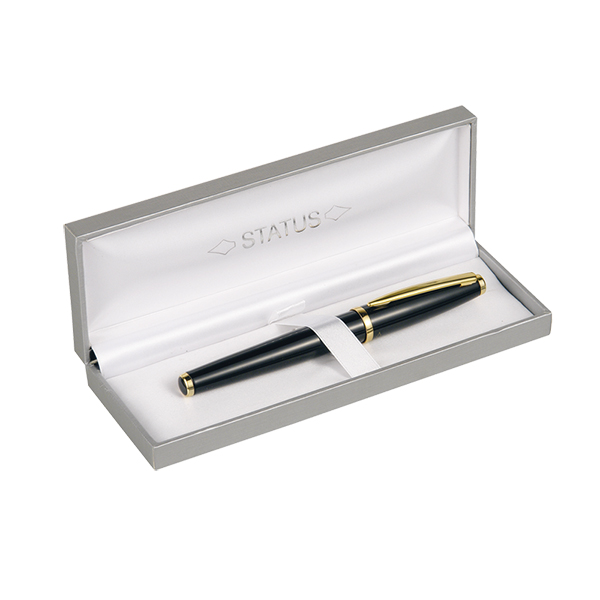 Ρόλερ Omega πολυτελείας μάρκας STATUS μαύρο με ασημί λεπτομέρειες σε γκρι κουτί με λευκό σατέν εσωτερικά