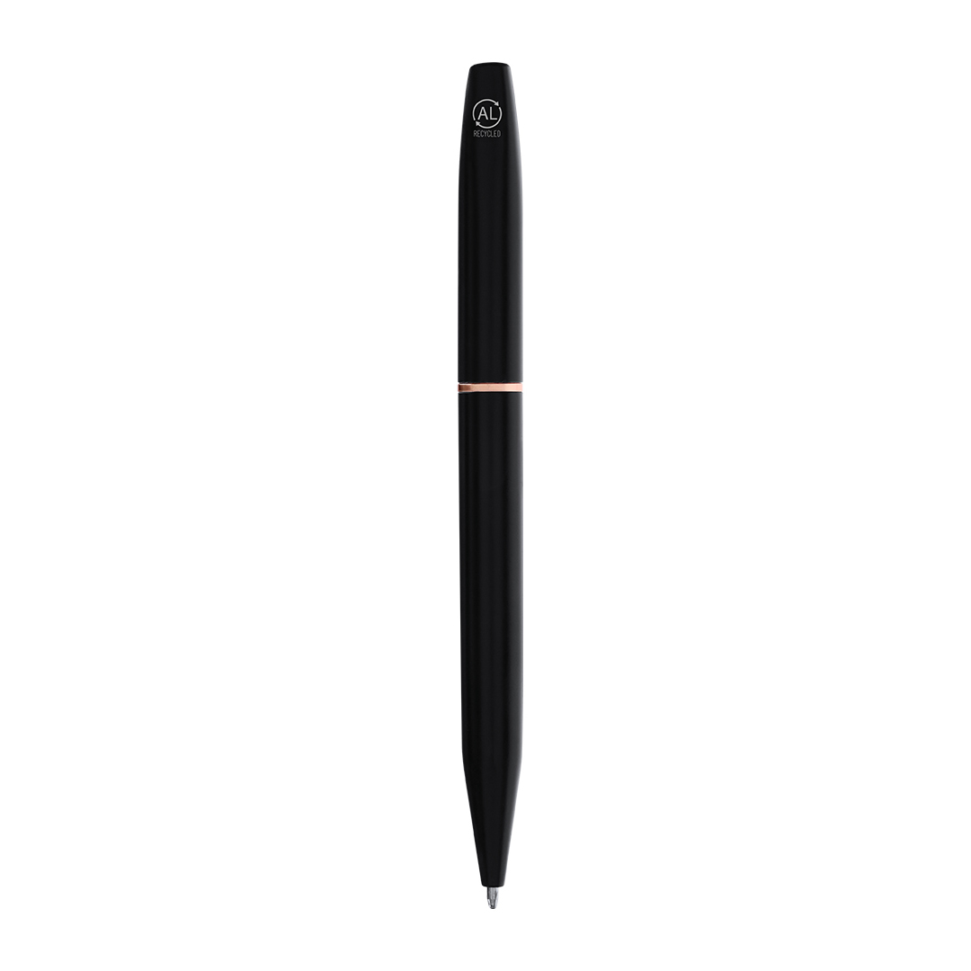 Το σετ ολοκληρώνεται με στυλό από ανακυκλωμένο αλουμίνιο σε μαύρο ματ χρώμα με ροζ χρυσούς τόνους και μεταλλικό κλιπ. Μηχανισμός περιστροφής και μπλε μελάνι, με λογότυπο ανακυκλωμένου αλουμινίου.