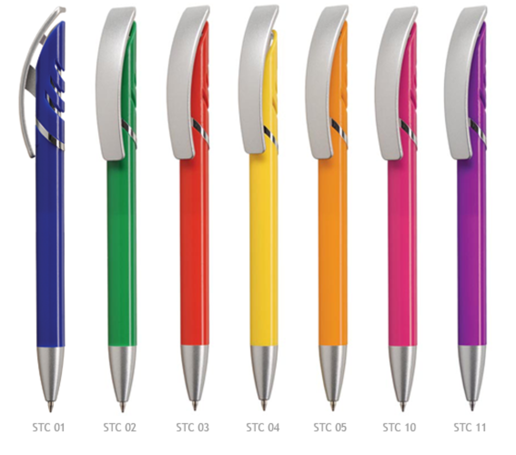 Πλαστικό στυλό με χρωματιστό σώμα και ασημί λεπτομέρειες.
